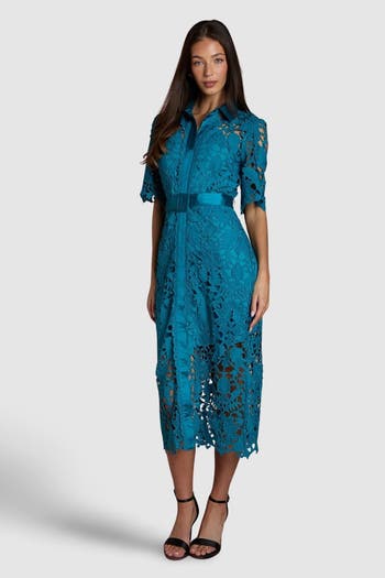 This stunning shirt dress combines timeless sophistication with contemporary design. The intricate lace pattern creates a beautiful textural contrast whilst maintaining an air of refined elegance. The classic collared neckline and button-down front offer a structured silhouette, beautifully complemented by the waist-defining belt.