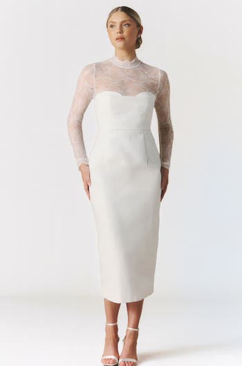 The most romantic and most effortlessly sophisticated lace midi dress, perfect for your engagement celebrations or even a gorgeous courthouse wedding. With a high neck and beautiful lace trim, the structured satin fabric has under-wiring and padded cups with a soft cowl depending on bust size.