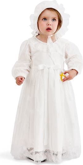- 100% PolyesterLong‑sleeve christening gown with lace detailingFitted bodice with ribbon waist accentFlowing full‑length skirt with ceremonial drapeMatching bonnet with ruffled trim and chin tieElegant design for baptisms and special occasionsImported