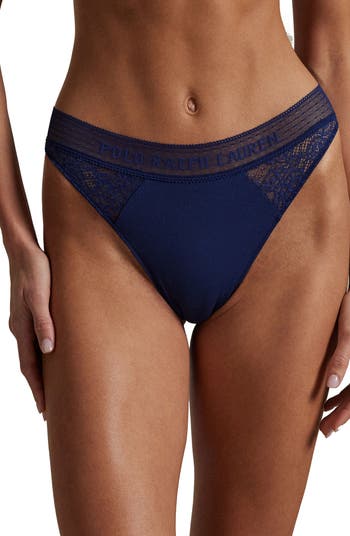 Tonal logos accent the waistband of an everyday-romantic thong that combines soft floral lace and stretchy cotton rib.
