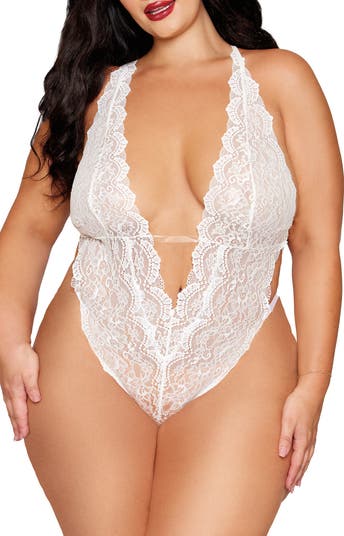 A plunging neckline and high-cut legs only add to the allure of this lace teddy finished with a strappy, barely-there back.