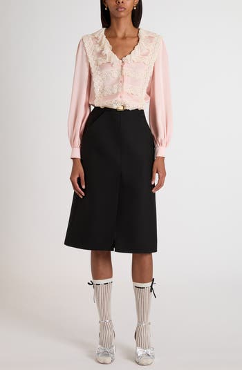 Channel one of Alessandro Michele's retro-eclectic runway characters in this hammered satin shirt decadently adorned with romantic floral lace and sheer chiffon ruffles.
