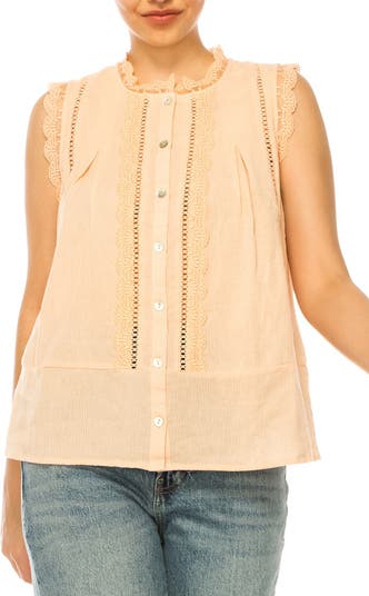 Delicate lace trim and openwork insets bring flirty charm to this cotton button-front top finished with a swingy hem.