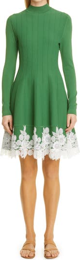 Delicate floral lace frosts the hem of a knit dress finished with dimensional rib stitching that accentuates the fit-and-flare silhouette.
