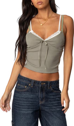 Complete your casual weekend look with the effortless style of this layered-look camisole detailed with lace trim and a sweet ribbon tie at the neckline.