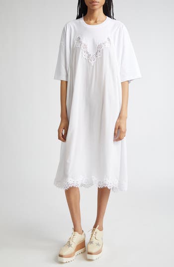 Gathered silk panels trimmed with delicate lace bring a lingerie-inspired look to this T-shirt dress sewn from cotton jersey.