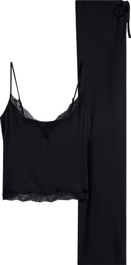 Plan an early bedtime or a lazy morning so you can spend more time in supersoft pajamas that offer a lace-trimmed cami top and drawstring bottoms.