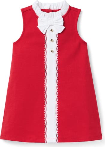 The perfect ponte dress designed with signature details. Featuring a ruffle collar, lace trim and gold-tone buttons. A bow adds the perfect finishing touch.