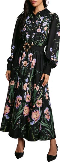 Elegant long sleeve shirt dress featuring a striking botanical placement print. Sophisticated collared neckline with delicate lace trim detailing. Flowing crepe fabric creates a graceful silhouette with excellent movement. Cinched waist with decorative buckle belt for a flattering, defined shape. Maxi length design with full skirt for dramatic occasion-ready appeal. This captivating coast shirt dress combines timeless elegance with contemporary flair.