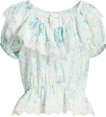 Airy and light, this peplum top is framed by puff sleeves and made with delicate eyelash-lace trim.