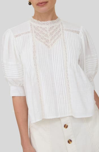 A beautiful combination of pleats and lace make this structured puff-sleeve blouse look like an absolute dream.