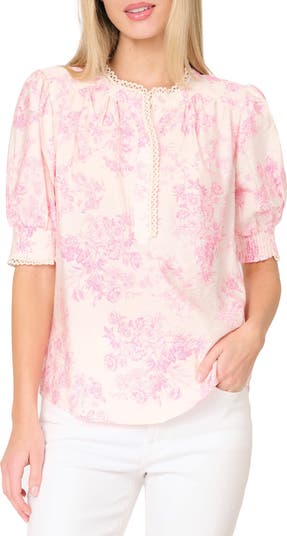 Lacy trim and pretty puff sleeves create a sweet style story for this lightweight top.