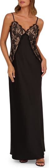 Cut to skim your curves, this luscious, lace-lilted satin gown will get glasses raised in tribute.