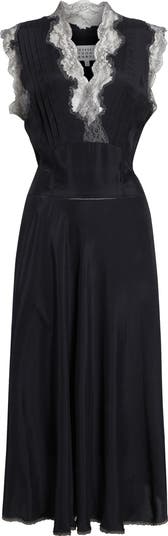 The French fashion house brings boudoir inspiration to this sleeveless midi dress crafted in Italy from silk-enhanced satin with fluid drape for understated elegance. The plunging neckline and sleeves are traced with sheer lace, while an attached belt cinches the waist.