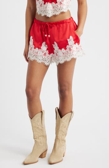 Rich floral lace romances these tie-waist shorts cut from glossy skin-skimming satin.