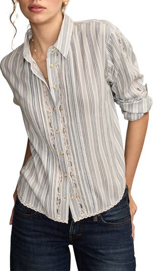 Lovely lace sweetens a polished shirt cut from a light and breezy cotton blend.