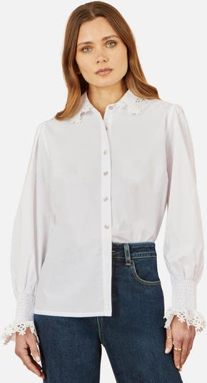 Level up your core wardrobe with this classic shirt. The button down design is an essential fit, with a beautiful collar and lace trims at the cuffs. Wear with denim for a smart casual vibe that will pass any fit check.