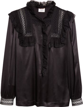 Pintucks framed by a patchwork of mixed lace form the bib of this pullover top crafted in Italy from luscious silk charmeuse and finished with ruffles capping the shoulders.