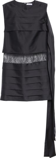 A band of sheer Chantilly lace reveals the curve of the hips on this showstopping shift-style minidress steeped in retro charm. Layers of horizontally pleated silk extend across the body to trail gracefully down past the hemline.