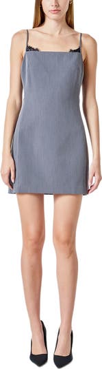 A soft stretch-kissed mini is suspended by slender adjustable straps and romanced by lovely lace peeking past the neckline.