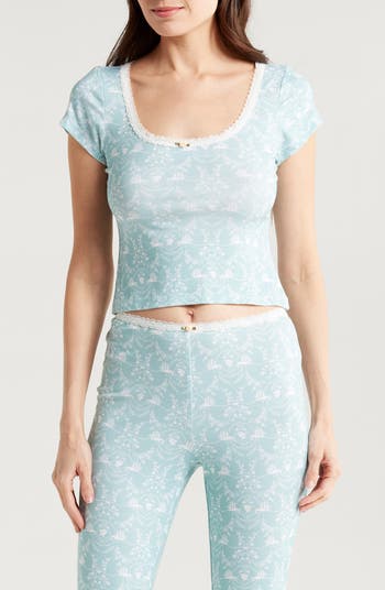 A rosette accent centers the lace trim on this crop top crafted from dreamy stretch-kissed modal and stamped with a regal pattern.