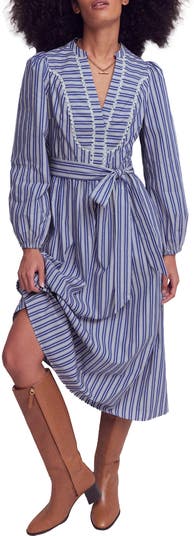 Lacy bits and puff sleeves sweeten a striped dress cut from lightweight cotton and cinched with a simple sash.