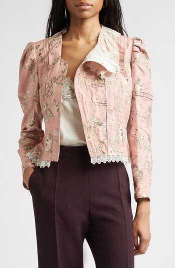 Precise pintucks accentuate the vintage-inspired aesthetic of this floral taffeta jacket cut in a fitted silhouette trimmed with lace.