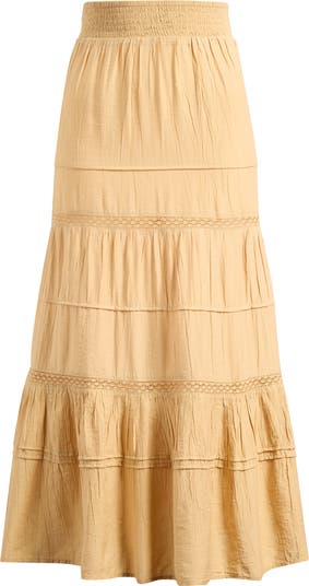 A lacy crinkle-textured maxi skirt is topped with waistline smocking and made in a flouncy tiered silhouette.