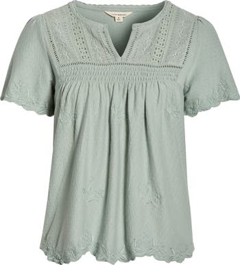 Airy ladder stitching and lovely lace add charm to this lightweight cotton top framed by fluttering sleeves.