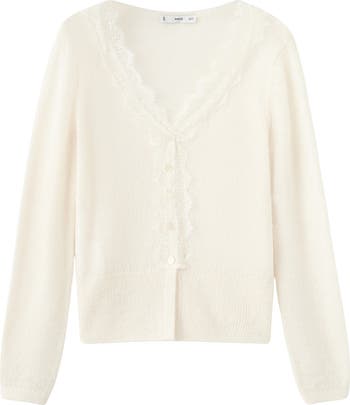 Airy and semisheer, this romantic cardigan is trimmed with eyelash lace at the V-neckline and knit with a hint of alpaca for extra softness.