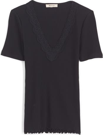 Trimmed with delicate lace, this V-neck top comes in a cozy rib with elongated short sleeves and can be worn layered or on its own.