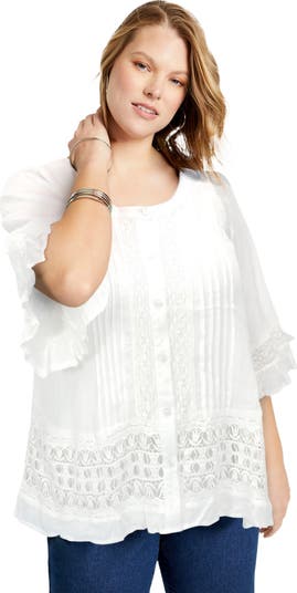 Embrace your bohemian side in this pretty lace-trimmed, button-front style. Finished with ruffles at the elbow-length raglan sleeves and lace trim at the hem, this top is perfect styled with your favorite jeans. Center-back pleats