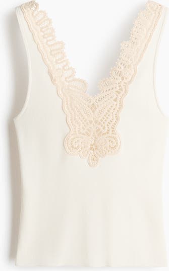 Sleeveless, fitted top in a soft, fine knit featuring a V-neckline with a sturdy lace trim at the front, scoop back, and a straight hem.