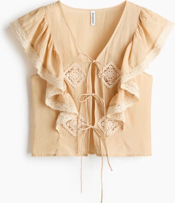 Sleeveless blouse in an airy weave made from a cotton and viscose blend with crochet-look details on the front. V-neckline, three pairs of ties at the front and a wide, lace-trimmed flounce over the shoulders that continues down the front and back.