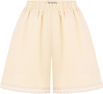 Matching high-waisted shorts featuring delicate lace-trimmed hems for a feminine, polished look.