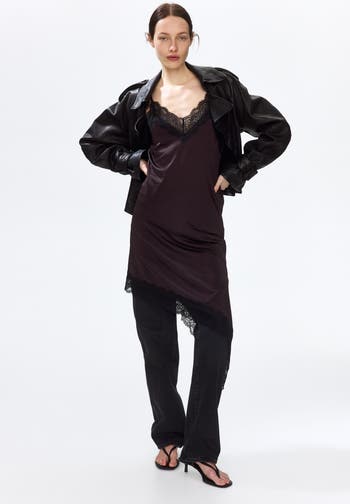 Calf-length dress in interlock jersey with lace trim at top and hem. Extra-narrow shoulder straps, V-neck, and an asymmetric hem.