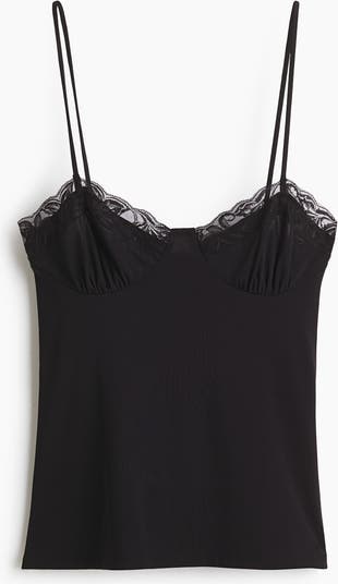 Top in soft jersey featuring a lace-trimmed scoop neckline, narrow, adjustable shoulder straps and gathered cups.