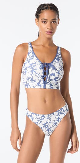 Wear this bikini top to the beach or as a crop top to brunch. A monotone floral print is femine while the lace up neckline is fierce. Removable Soft Cups Adjustable Straps