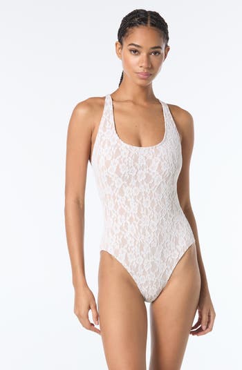 Coverage in the front, statement in the back. This one piece wows with an open cross back. Adjust the straps for comfort. An allover lace adds sultry sophistication to your swim style.