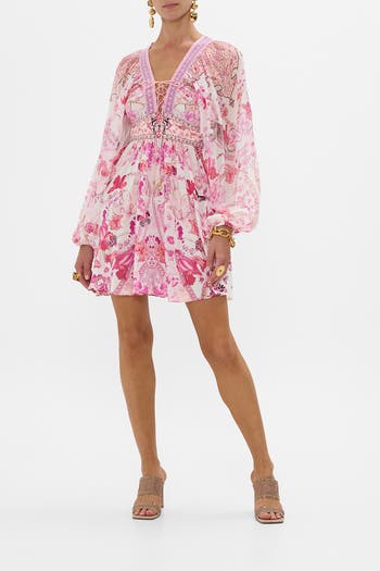 Designed in Australia, the Botanical Novella Lace Up Front Short Dress is inspired by the opulent taxidermy room at the illustrious Al Manial Palace, encapsulating timeless elegance with butterflies delicately settled amid vivid palace florals and gilded borders. Lovingly handcrafted, this dress combines a fitted bodice with a flared skirt for a flattering silhouette. Featuring a short length, full-length blouson raglan sleeves with elasticated cuffs, and a lace-up front with bespoke CAMILLA tassels, it exudes sophisticated charm.