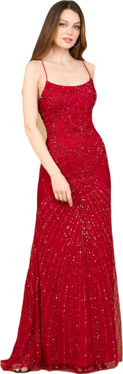 This stunning dress features intricate beadwork and a sexy lace up open back. The fitted silhouette and straight neckline are perfect for prom or any formal occasion. Stand out from the crowd and make a statement in this beaded beauty!