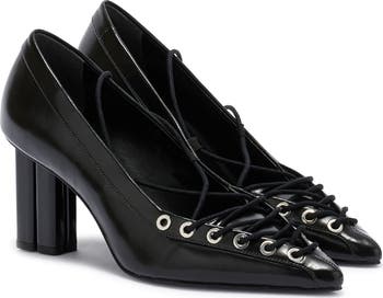 Polished grommet hardware accentuates the pointy toe and lace-up styling of this moto-chic block-heel pump.