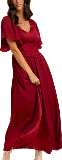 Channel your inner romantic with this Knit & Lounge maxi dress, crafted with airy flutter sleeves, a flattering V-neckline, and an intricate lace waistband. Perfect for elevated gatherings or an effortlessly chic day look.