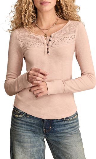 Detailed with touches of lace and embroidered eyelets, this stretch-cotton henley furthers the pretty look with filigree buttons.