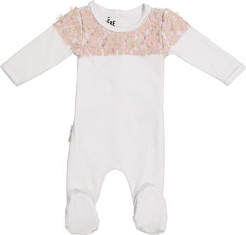 A frilly lace yoke with 3D flower appliqués lends delicate detail to this long-sleeve footie cut from cotton-rich fabric.