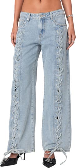 Corset-inspired lacing on the legs adds playful dimension to these low-rise, wide-leg jeans made from sturdy nonstretch denim.