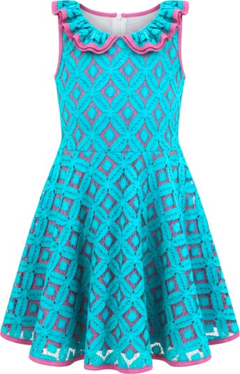 - Features a vibrant teal lace overlay with a soft pink underlay for a fun, eye-catching contrast
