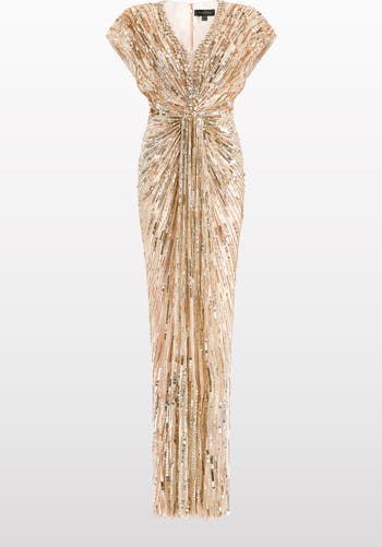 This evening gown radiates sophistication with its plunging neckline, cap sleeves, and gathered waistline that creates a beautifully draped silhouette. The linear sequin embellishment elongates the figure while adding a striking, light-reflecting finish. Detailed beadwork along the neckline enhances its luxurious appeal, elevating the overall design with a couture sensibility. Perfect for black-tie occasions, red carpet events, or elegant receptions, this gown delivers timeless glamour with modern refinement.