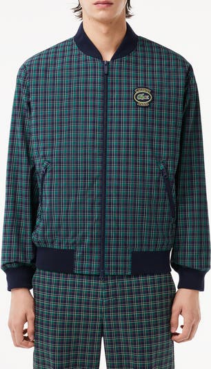 A heritage plaid and croc logo patch amplify the classic appeal of a lightweight, water-repellent bomber jacket edged by soft ribbed trim.