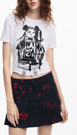 Red peeks through this pleated miniskirt to deliver a subtle-but-striking pop of color.